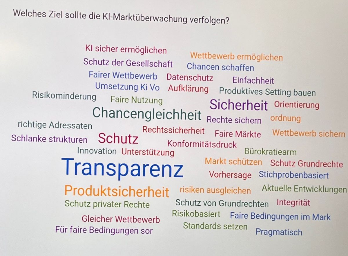 Zu Beginn der Session wurden die Teilnehmenden gefragt, was sie mit dem Begriff „Marktüberwachung“ assoziieren. Die meistgenannten Begriffe lauteten „Sicherheit“ und „Kontrolle“; aber auch die „Bürokratie“ befand sich unter den Top 3. Betont wurde, dass die Marktüberwachung diejenigen unterstützen soll, die sich an die Regeln halten und eine Hürde für diejenigen darstellt, die gegen Regeln verstoßen. Wesentliche Ziele der Marktüberwachung seien, der Verbraucherschutz (vor nicht-rechtskonformen KI-Systemen), die Wettbewerbsgleichheit sowie die Verhältnismäßigkeit (wobei der mögliche Schaden betrachtet werden soll).