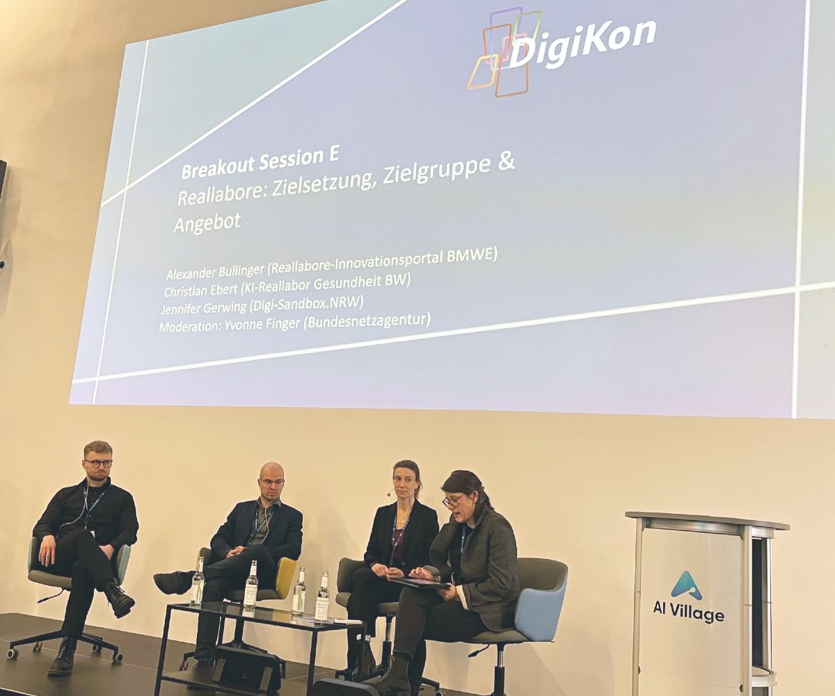 Jennifer Gerwing nahm für Digi-Sandbox.NRW an der meistbesuchten Breakout-Session „Reallabore: Zielsetzung, Zielgruppe und Angebot“ teil. In NRW dienen Reallabore vor allem der Beschleunigung von Innovation sowie dem regulatorischen Lernen. Zudem stärken sie das regionale Innovationsökosystem und unterstützen die Transformation. Als Erfolgsgeschichte von Digi-Sandbox.NRW wurde das Forschungsprojekt und Reallabor Industrie 4.0 Recht-Testbed benannt, denn hier gelang der Transfer in die Praxis: ein Startup bietet nun Vertragsautomatisierung für Unternehmensprozesse an. Im Hinblick auf das KI-Reallabor dürfte insbesondere Artikel 59 der KI-Verordnung relevant sein, wonach rechtmäßig für andere Zwecke erhobene personenbezogene Daten für die Entwicklung, das Training und Testen bestimmter KI‑Systeme im KI- Reallabor verarbeitet werden dürfen.